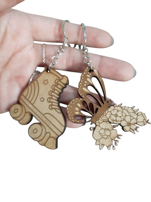Llaveros cortados en fibrofácil, listos para personalizar con nombre, frase o diseño a elección.